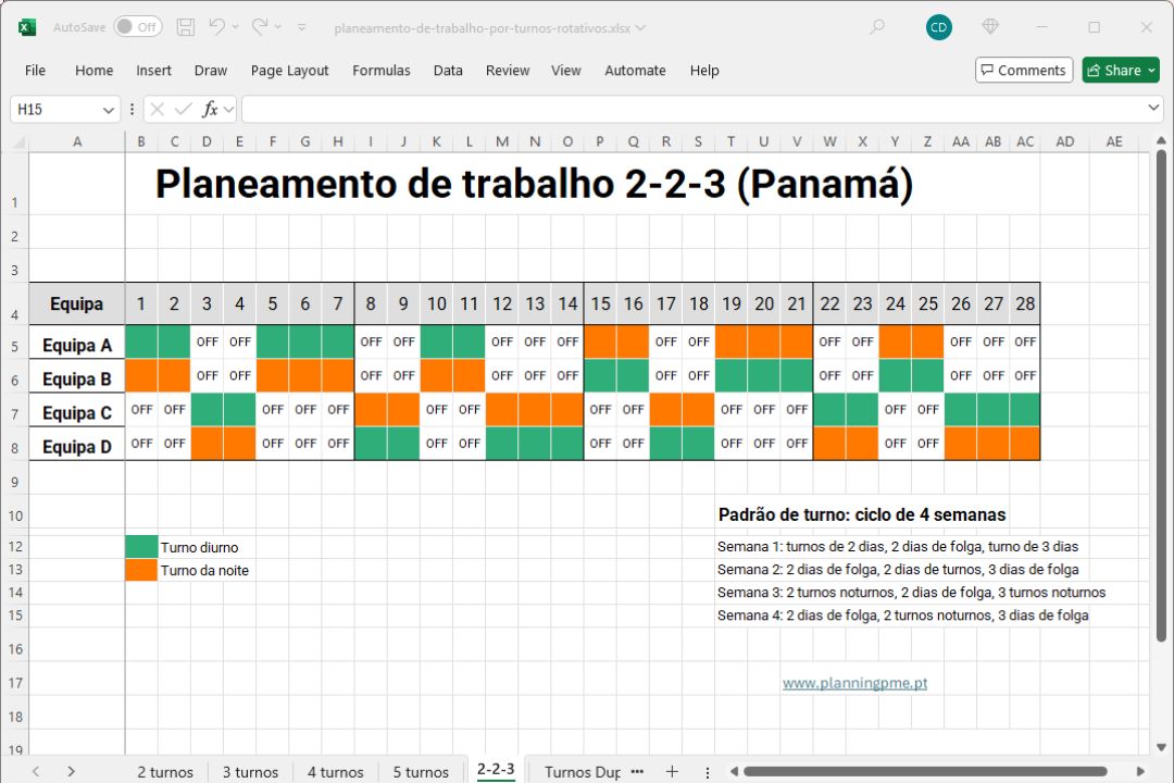 Está à procura de uma forma fácil de gerir um padrão de turnos 2-2-3? Estes modelos de horários gratuitos foram concebidos para o ajudar a configurar e manter rapidamente um horário de trabalho 2-2-3, também conhecido como horário Panamá, com o PlanningPME ou o Excel.