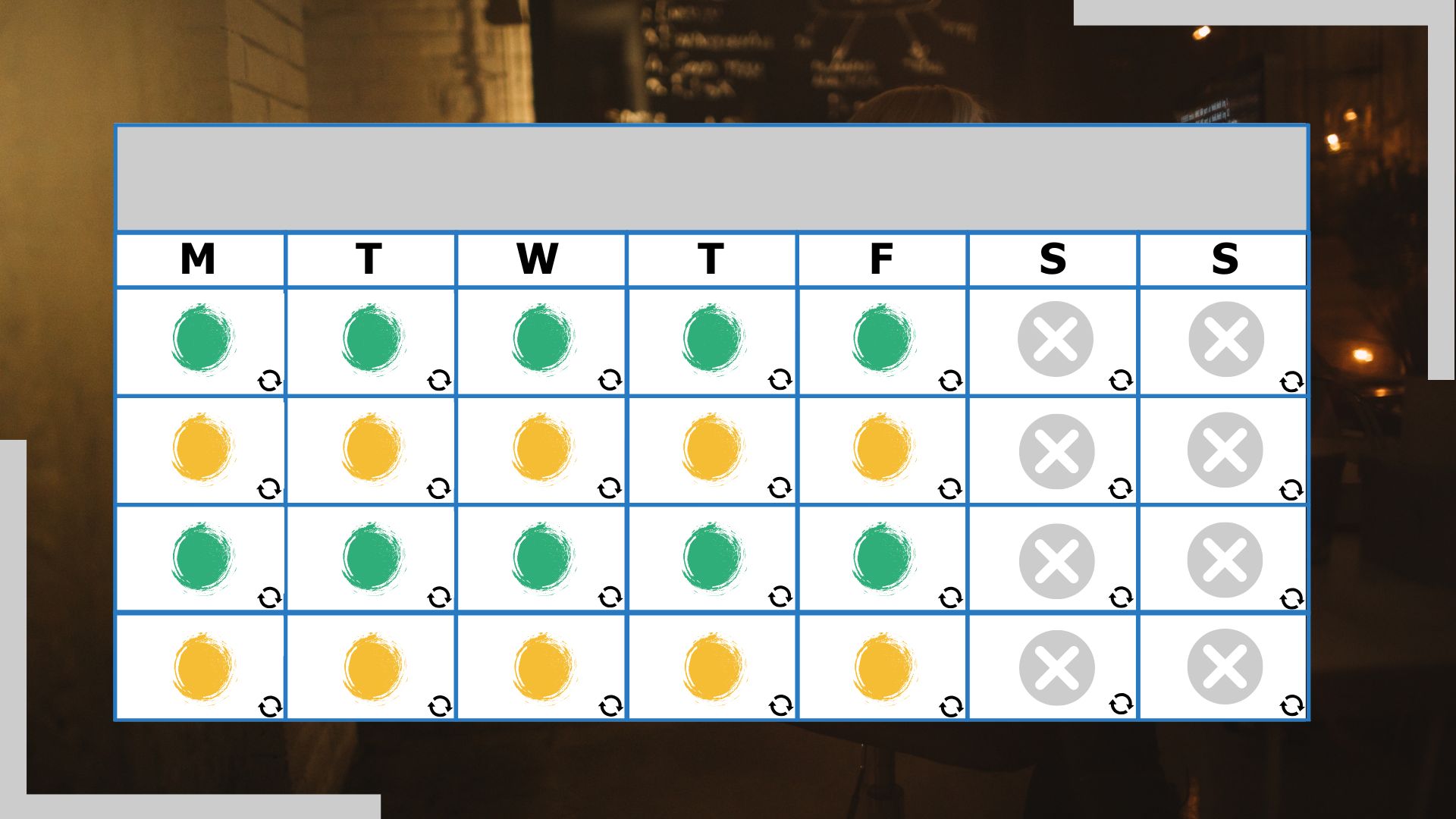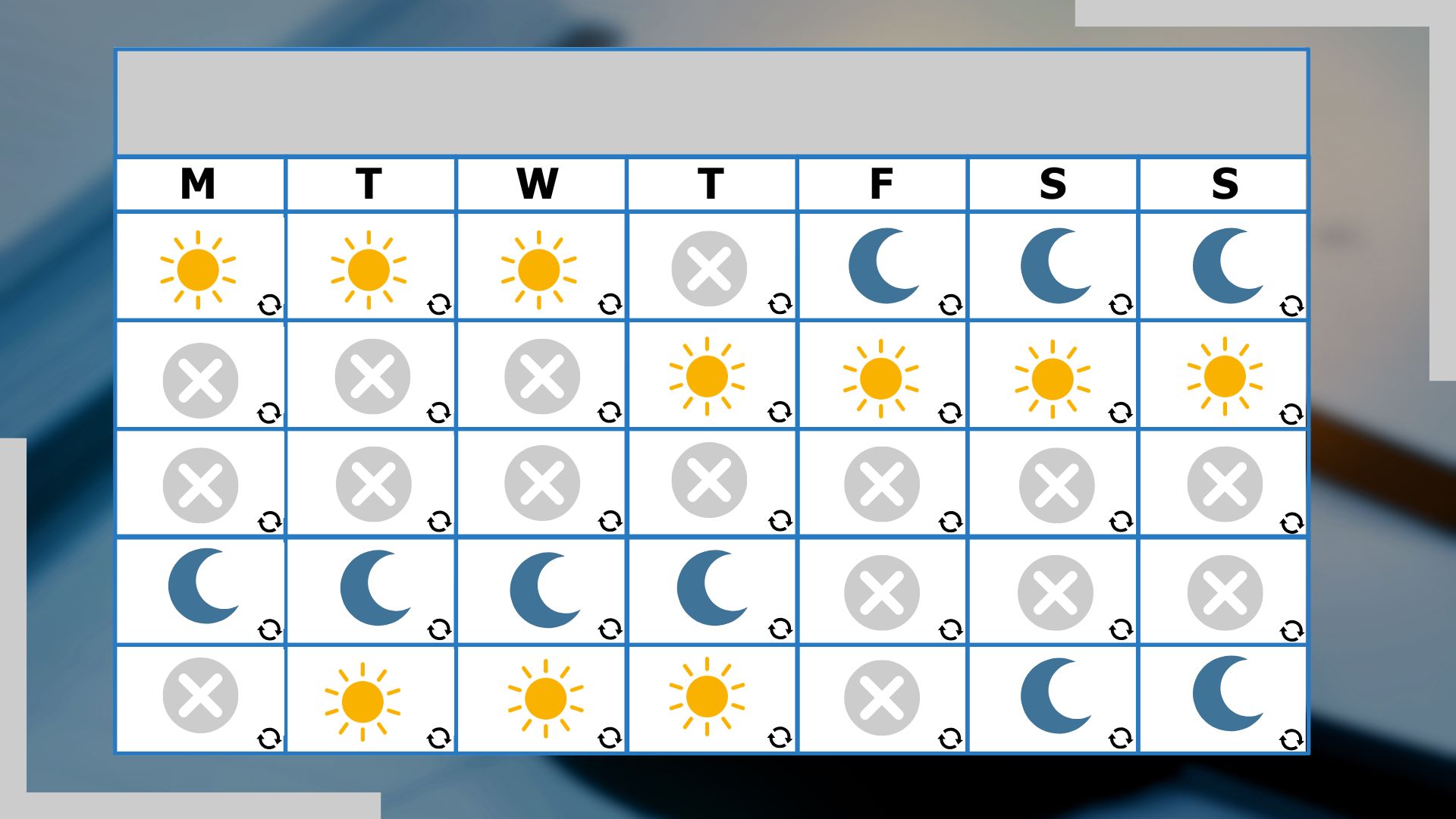 Existem muitas formas diferentes de criar planeamentos de turnos rotativos. Eis alguns horários de turnos rotativos comuns utilizados em diferentes sectores.